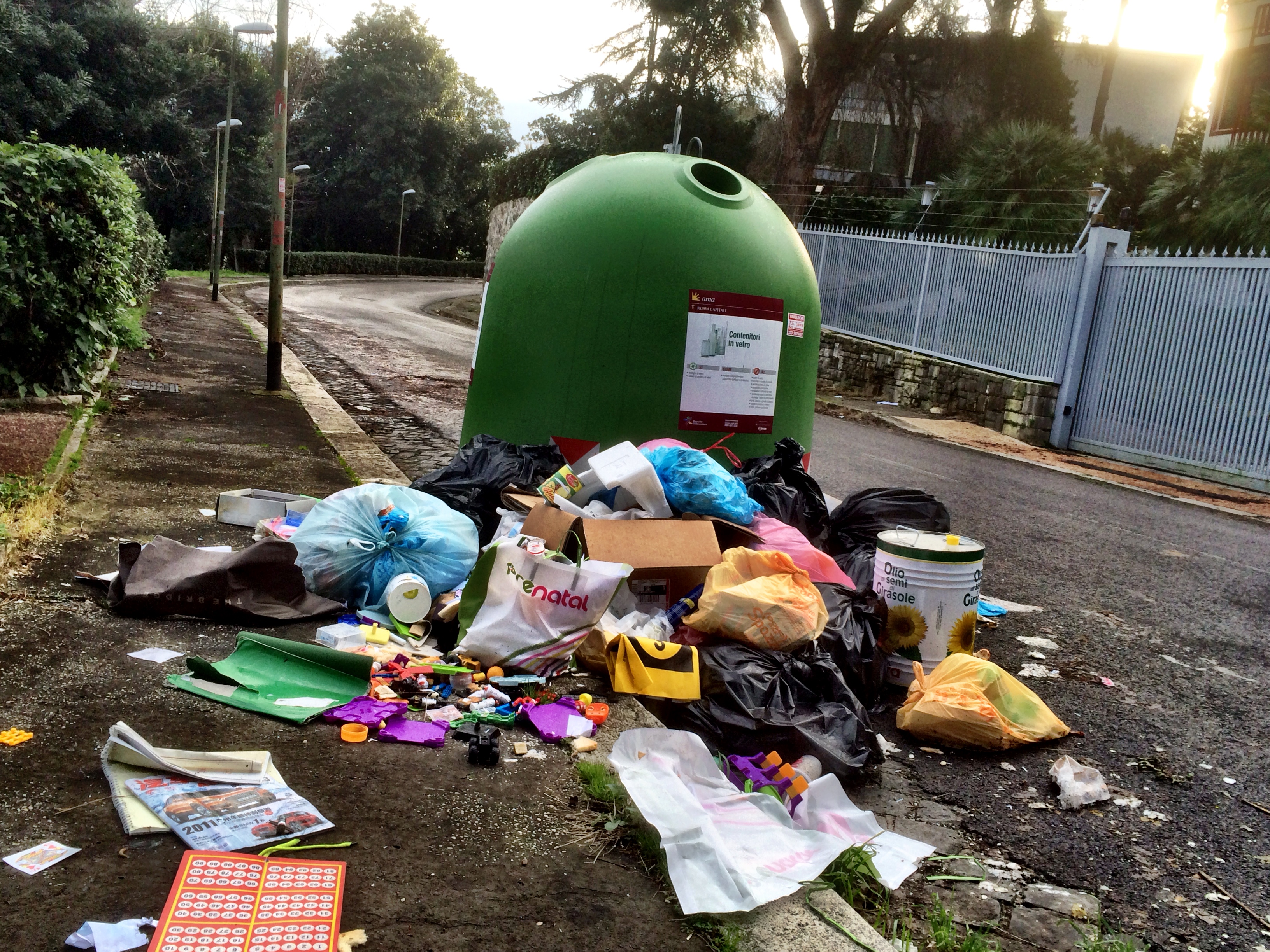 In parte, alla maleducazione dei residenti all’Eur, che buttano i loro rifiuti dove capita oppure – e chissà perché questo dovrebbe essere meno maleducato – vicino alle campane del vetro. Con grande gioia dei gabbiani, delle cornacchie e delle pantegane.